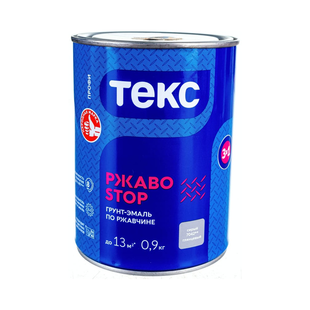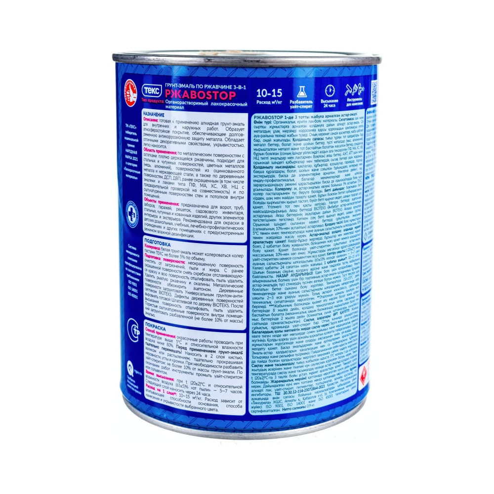 Грунт - эмаль по ржавчине Текс предназначена для окраски металлических поверхностей с остатками плотно держащейся ржавчины, эксплуатируемых в атмосферных условиях (металлические конструкции, гаражи, ограды, решетки) и внутри помещений. Подходит для стальных и чугунных поверхностей, цветных металлов, поверхностей из оцинкованного металла и нержавеющей стали. Может использоваться как универсальная эмаль для окраски деревянных поверхностей. Рекомендована для окраски в детских дошкольных, учебных, а также в лечебно-профилактических учреждениях. Особенности: • Позволяет проводить окраску металлических поверхностей без дополнительного использования грунтовки и преобразователя ржавчины • Обеспечивает высокие защитные свойства как на ржавой поверхности, так и на чистом металле • Формула 3 в 1 (преобразователь ржавчины, антикоррозионная грунтовка, эмаль) • Долговечность покрытия до 8 лет • Подходит для цветных металлов • Может наноситься на остатки старых ЛКМ • Отличная укрывистость в два слоя Технические характеристики: • Тип: алкидная • Покрытие на 1 кг: 10-15 м² • Расход краски: 0.06-0.1 кг/м² • Степень блеска: глянцевый • Температура основания: +10 °С • Min температура эксплуатации: -50 °С • Max температура эксплуатации: 60 °С • Время высыхания между слоями: 24 ч • Время полного высыхания: 24 ч • Срок годности: 24 мес • Цвет: серая • Объем: 0.8 л • Вес: 0.9 кг