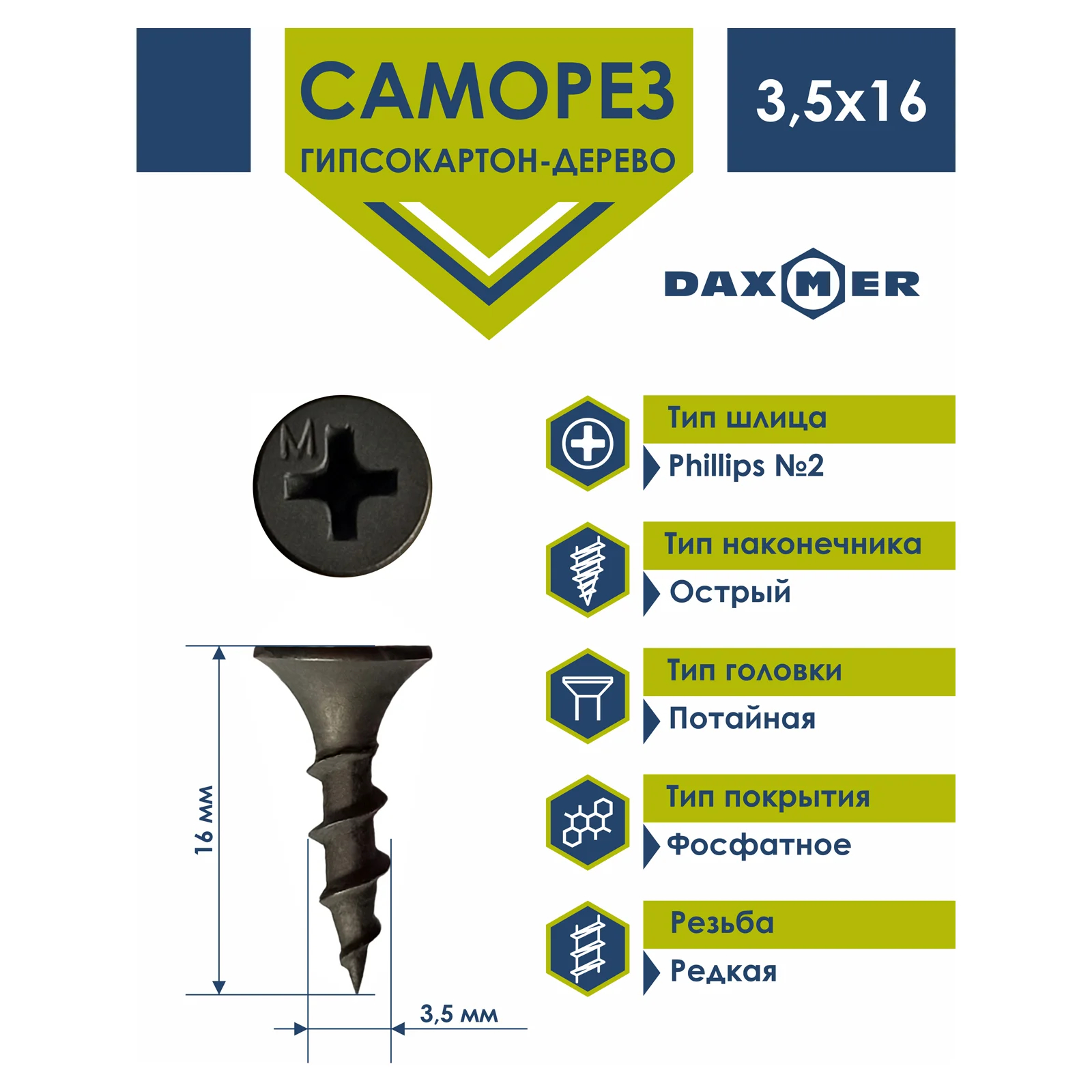 Cаморез ГКЛ по дереву усиленный Daxmer используется для крепления гипсокартонных плит, фанеры, OSB к деревянному или полимерному основанию без предварительного сверления. Саморезы и шурупы по дереву востребованы в процессе проведения ремонтных и отделочных работ, активно применяются для фиксации мелких элементов и частей конструкций из массива, полимера, гипсокартона. Метиз представляет собой классический остроконечный шуруп с резьбой по всему стержню. Имеет фосфатное покрытие, надёжно защищающее от коррозии, шляпку с крестообразным шлицем Phillips № 2. Подходит для потайного монтажа - может быть утоплен полностью. Особенности: • Геометрические размеры и механические свойства саморезов ГКЛ по дереву Daxmer соответствуют национальному стандарту • Защищён от подделки фирменной маркировкой "М" • Высокая скорость всверливания в стальной профиль до 1 секунды - возможно использование с системами автоматической подачи крепежа • Термообработка на австрийском оборудовании гарантирует высокие прочностные свойства, без изгиба изделия и срыва головы при ударной нагрузке • Коррозионную защиту и высокую адгезию к ЛКП и отделочным материалам обеспечивает цинк-фосфатное покрытие